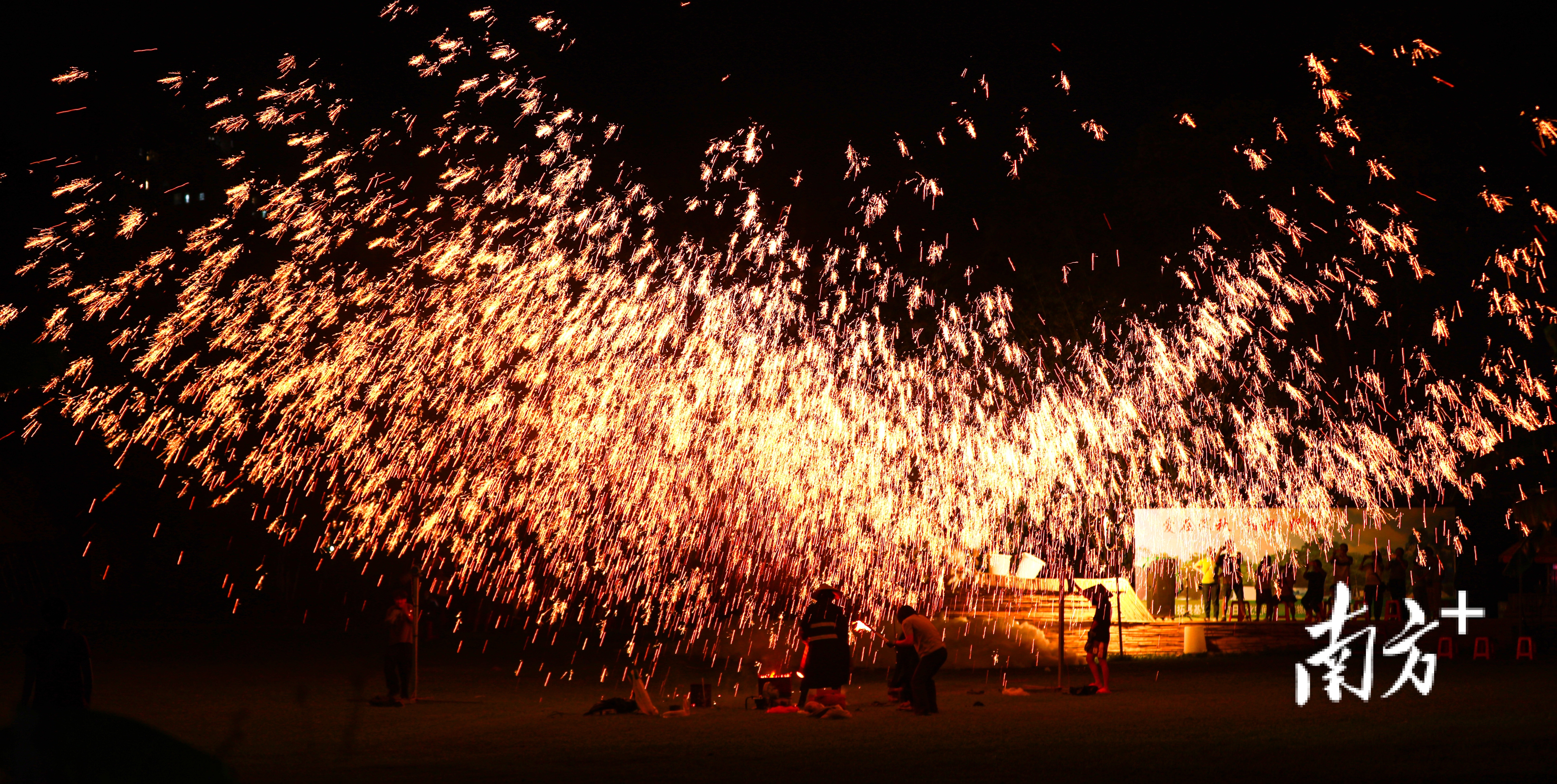 6月28日,清远市清城区田龙社区非遗表演训练基地进行非遗打铁花表演。南方+拍客 刘醉红 摄