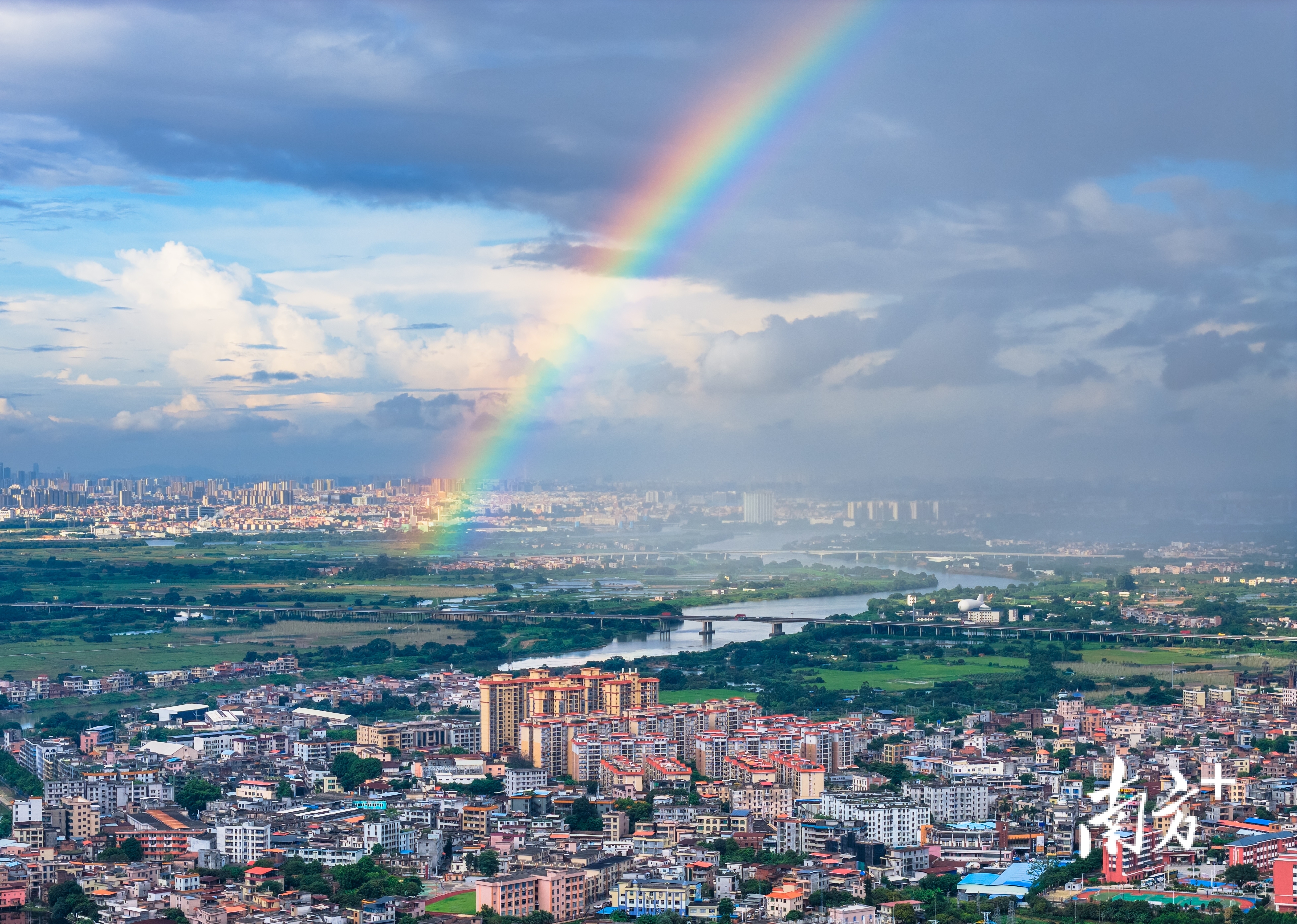 6月30日,广州市增城区石滩镇,一道绚丽彩虹横跨天际。南方+拍客 卞伟峰 摄