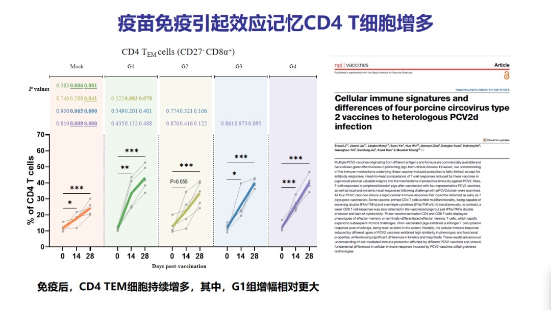 扬州大学兽医学院比较医学研究所比较四种使用不同类型抗原和佐剂的PCV2疫苗发现,硕腾“瑞圆舒”(G1组)在免疫14天后,疫苗激发的CD4+T细胞数量增幅最大。